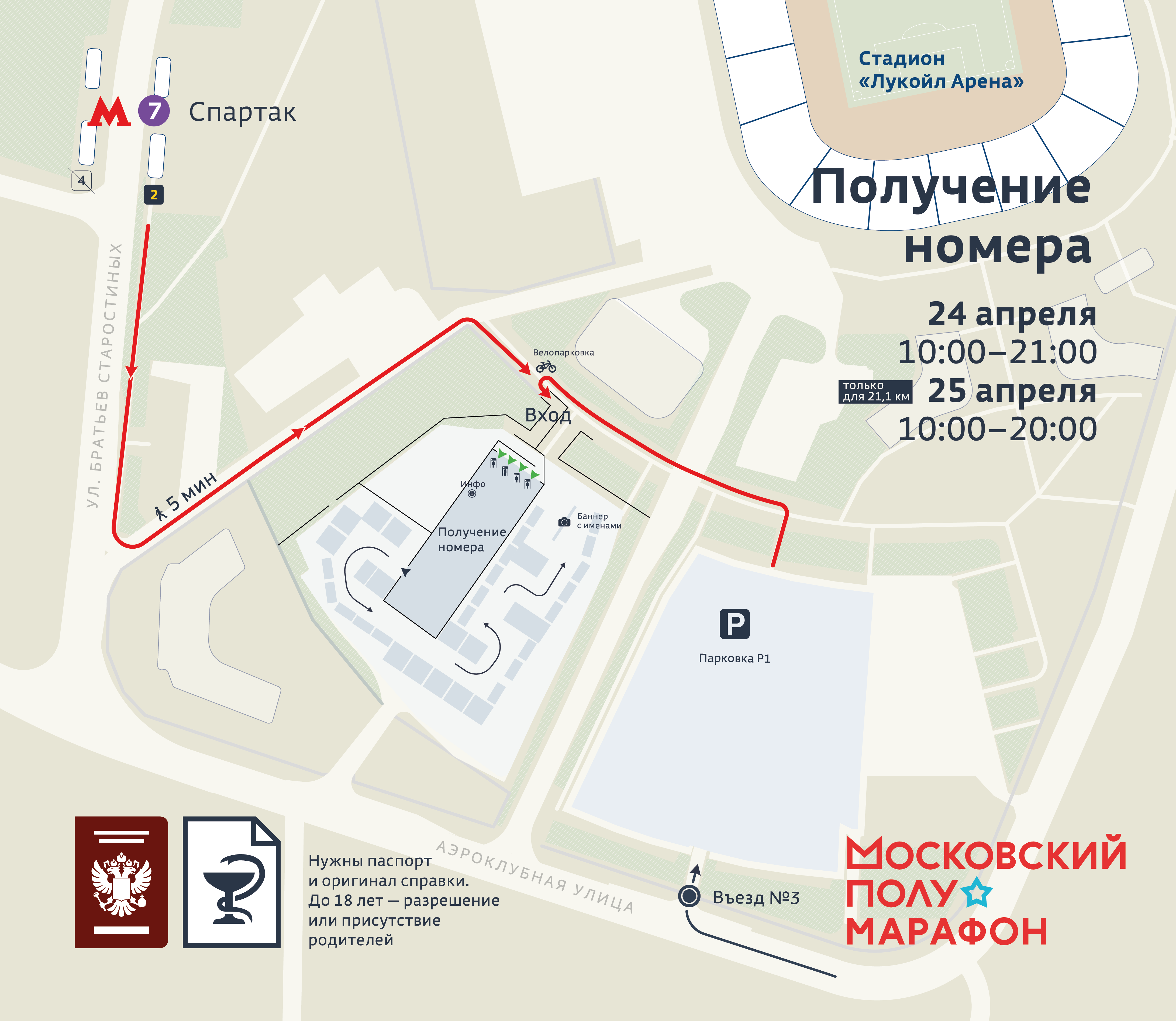 7:00 — Открытие финишного городка, начало работы раздевалок и камер хранения для участников на территории Олимпийского комплекса «Лужники».